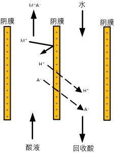 將擴(kuò)散滲析陰膜、滲析室隔板以及擴(kuò)散室隔板按一定順序排列起來(lái),在兩側(cè)放置配水板并用夾緊板夾緊的分離酸的設(shè)備。