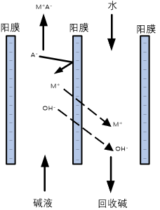 堿回收擴散滲析過程以濃差為驅(qū)動力,利用陽離子交換膜對堿的選擇透過性和對鹽或其它組分的高截留性,實現(xiàn)溶液中堿與鹽或其它組分的分離,分離出的堿溶液回用于生產(chǎn)工藝。