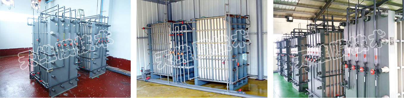 將擴散滲析陽膜、滲析室隔板以及擴散室隔板按一定順序排列起來,在兩側(cè)放置配水板并用夾緊板夾緊的分離堿的設(shè)備。